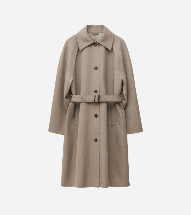 A refined wrap-style wool blend trench coat with a straight silhouette — elegant, versatile, and an accessible alternative for a minimalist capsule.