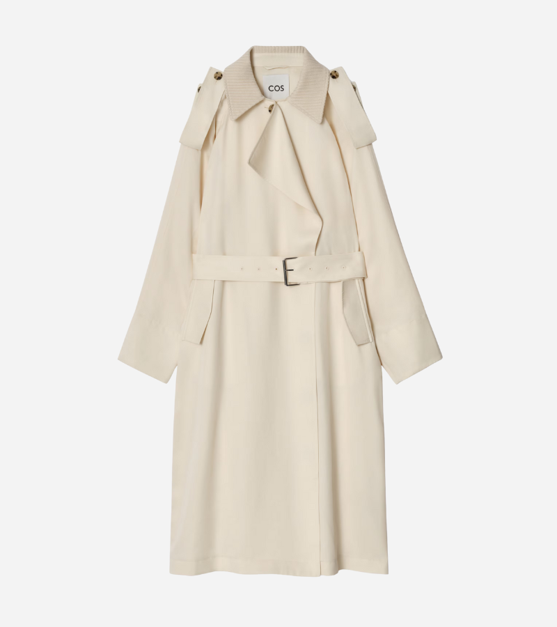 In a minimalist spring capsule wardrobe, a well-cut style like a long gabardine trench coat from Matteau offers effortless polish for daily wear, while a softly structured option such as a belted wool trench from & Other Stories adds warmth and refinement on cooler spring days without feeling heavy.
